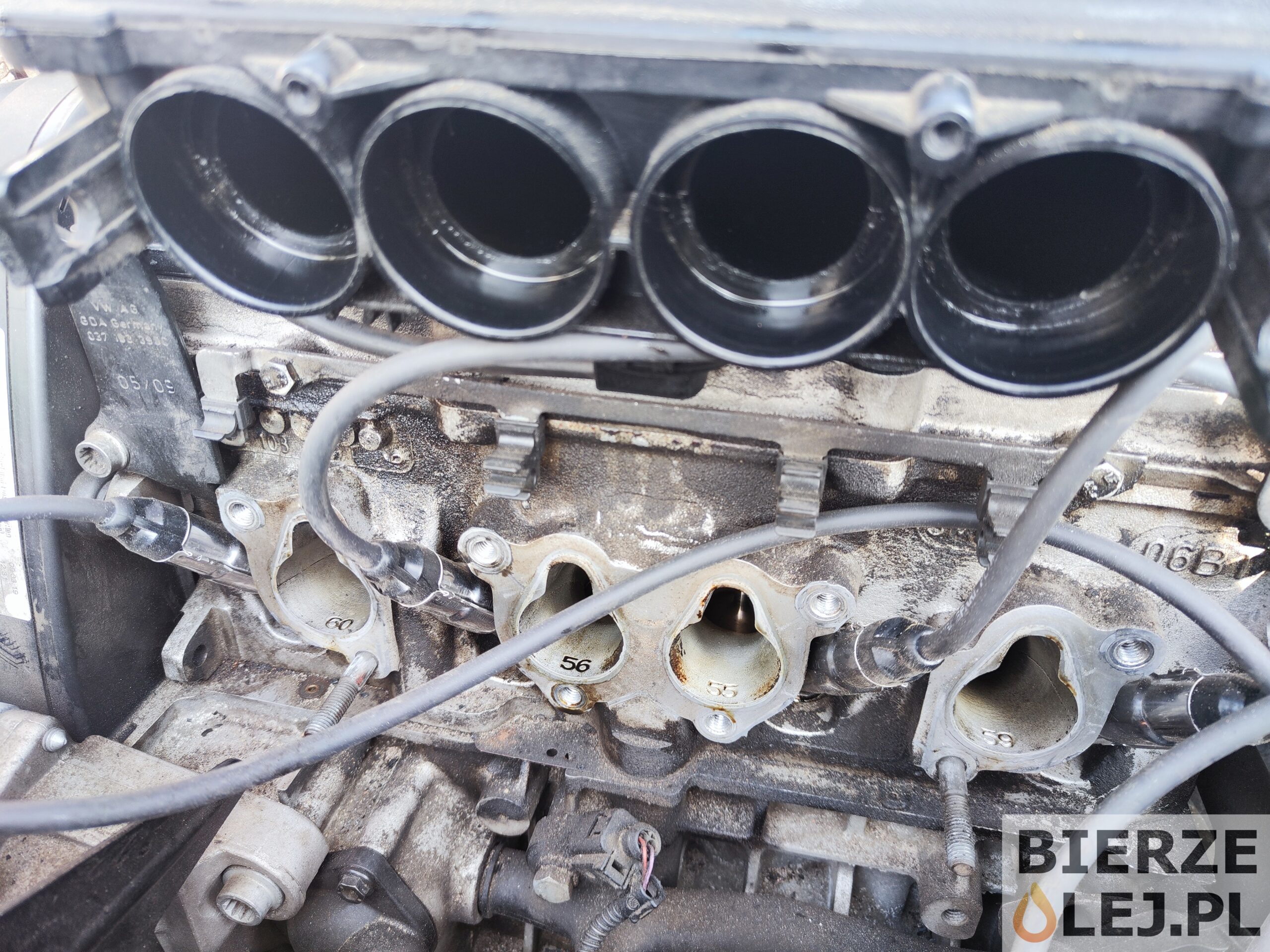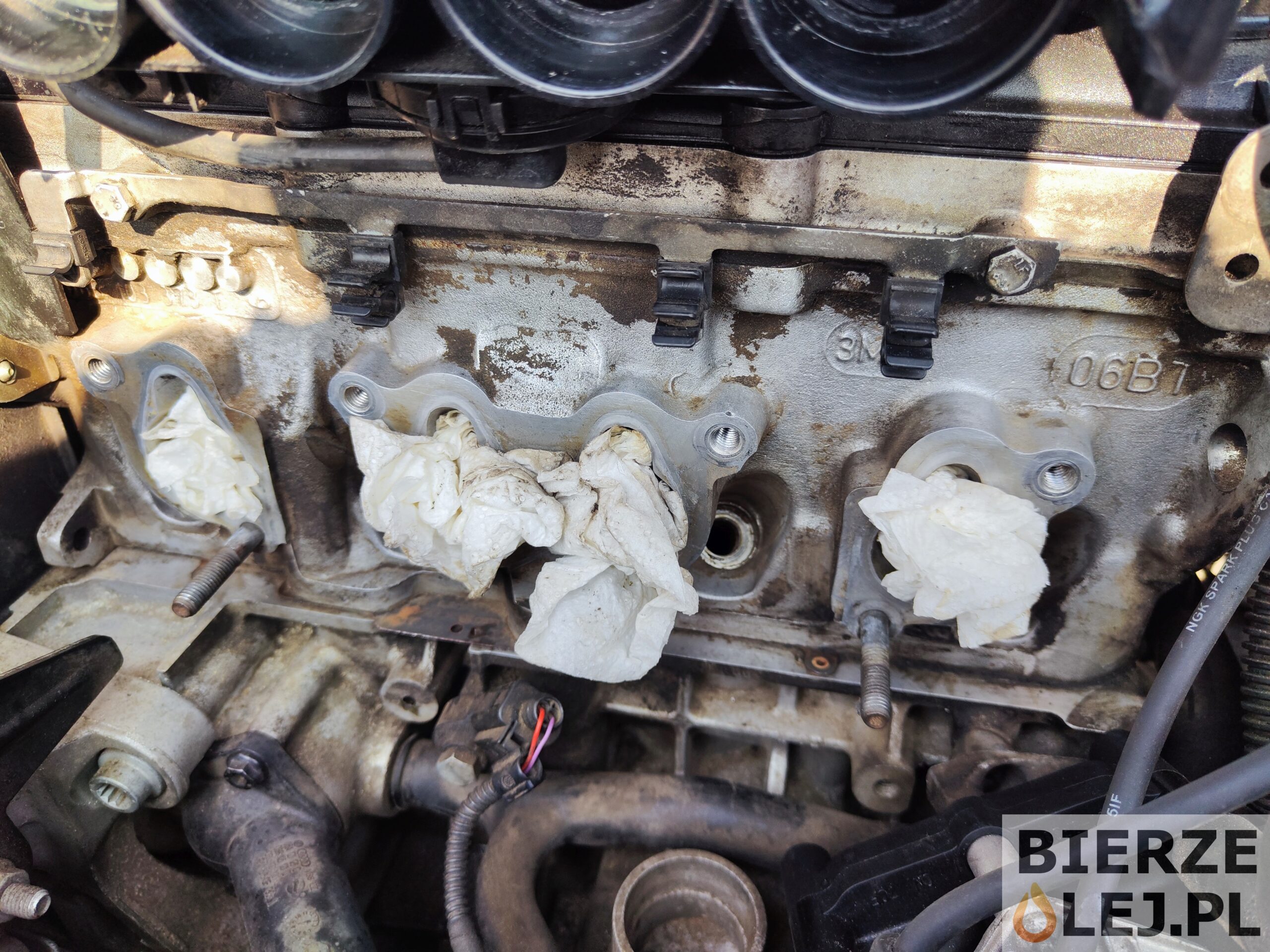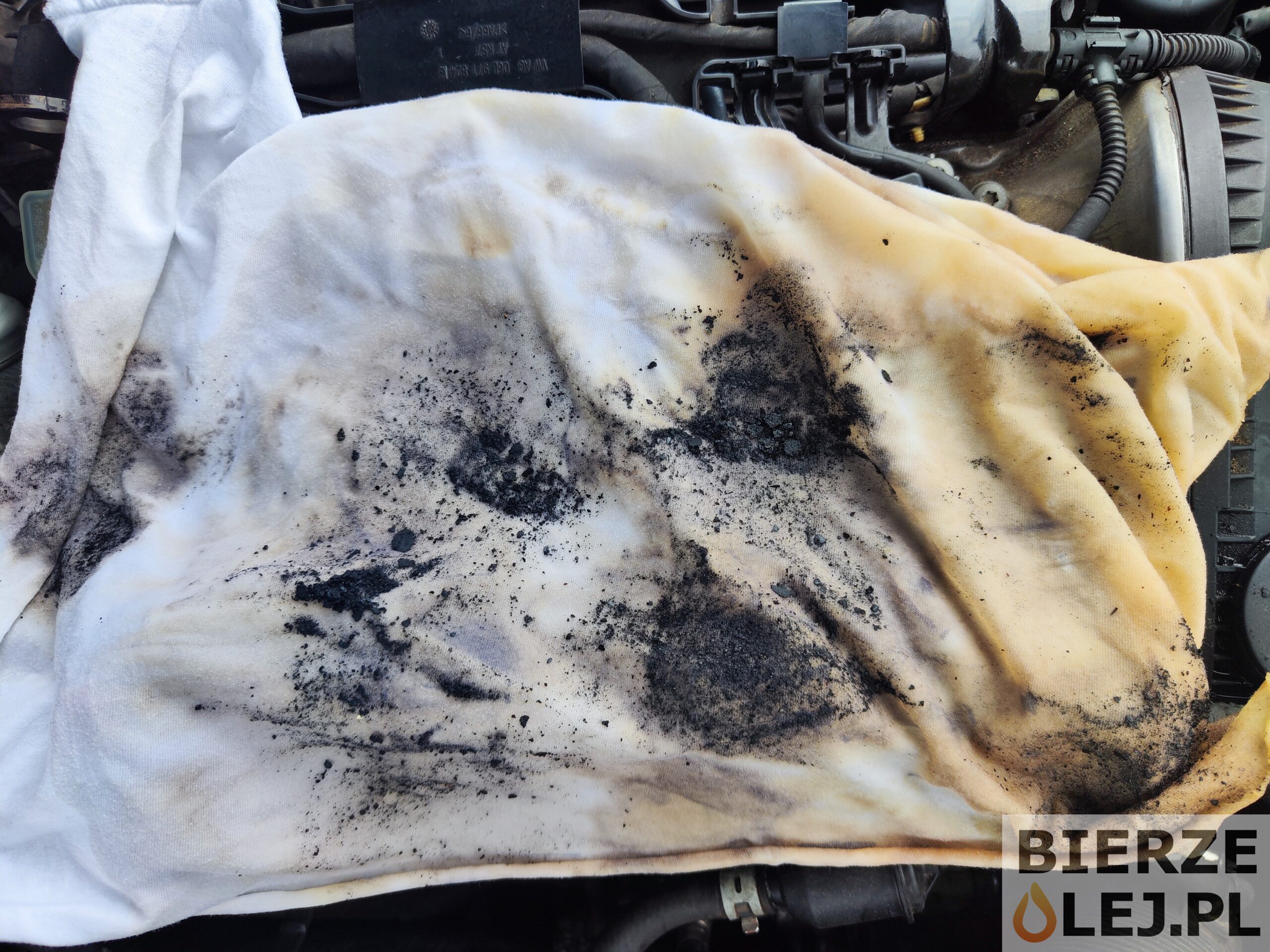 Objawy: przez ostatnie 10 lat pobór oleju kształtował się na poziomie 1 litr na 10 tysięcy km, większe zużycie oleju dało się zauważyć przy prędkościach autostradowych. Pół roku temu zostały wymienione m.in. uszczelniacze zaworowe i od tego czasu zużycie oleju wzrosło do 1 litra na 1 tysiąc km, ponadto doszło wypadanie zapłonu na 1 cylindrze, a świeca była czarna od nagaru. Prawdopodobnie efektem wymiany było uszczelnienie góry silnika (pokrywy zaworów) co spowodowało zwiększenie ciśnienia w skrzyni korbowej, a w efekcie ubytek oleju przez różne uszczelki wewnątrz silnika i/lub odmę oraz tłoki.